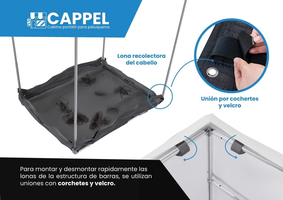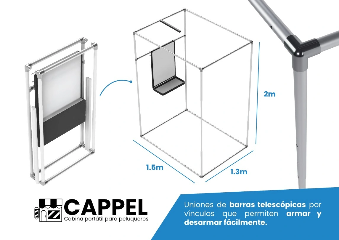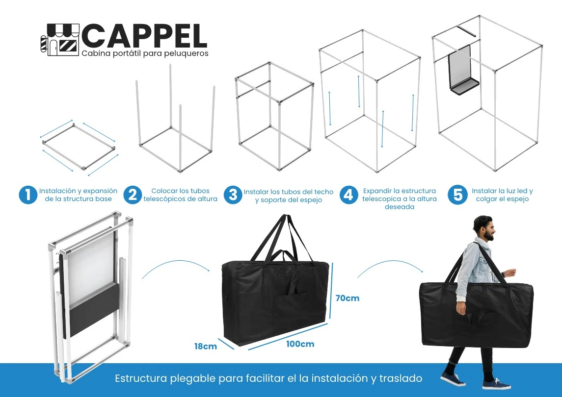 Fácil de transportar y montar, ideal como cabina de peluquería portátil para peluqueros a domicilio.