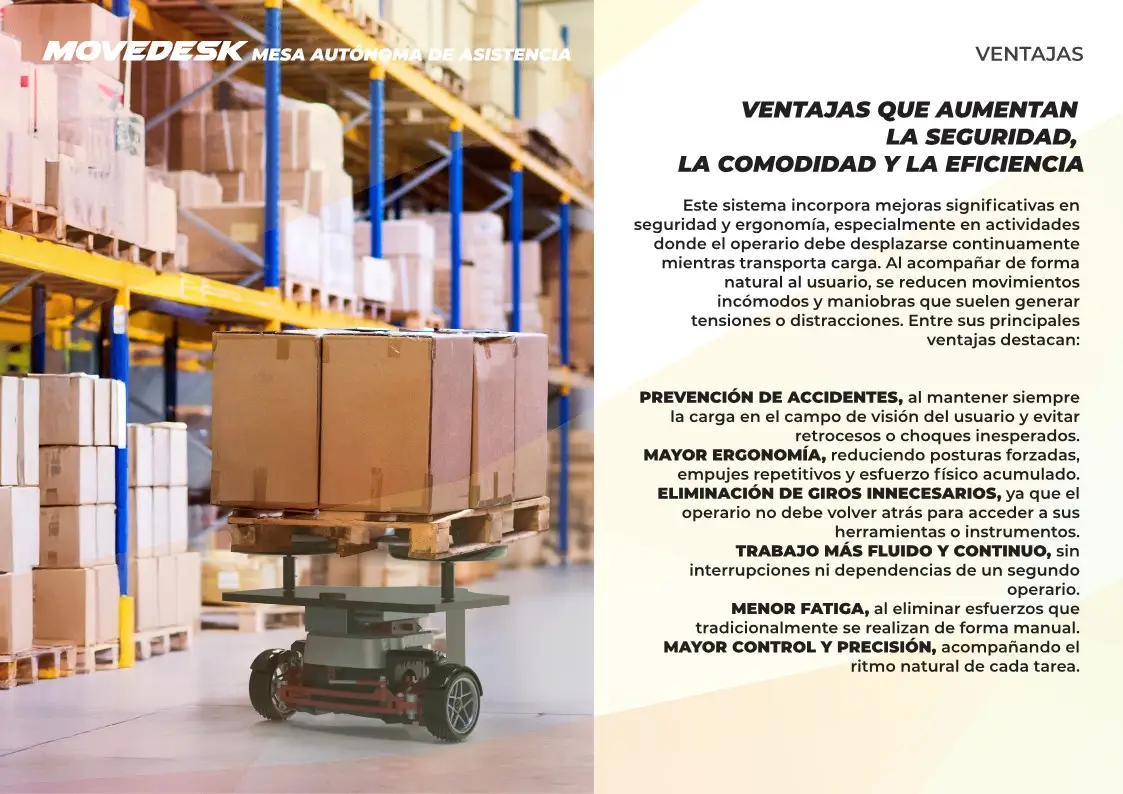 • Reducción del Esfuerzo Físico: Elimina la necesidad de empujar cargas pesadas, mejorando la salud laboral.