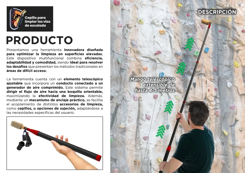 Cepillo + pinza con mosquetón: limpia y se fija al muro para mayor seguridad