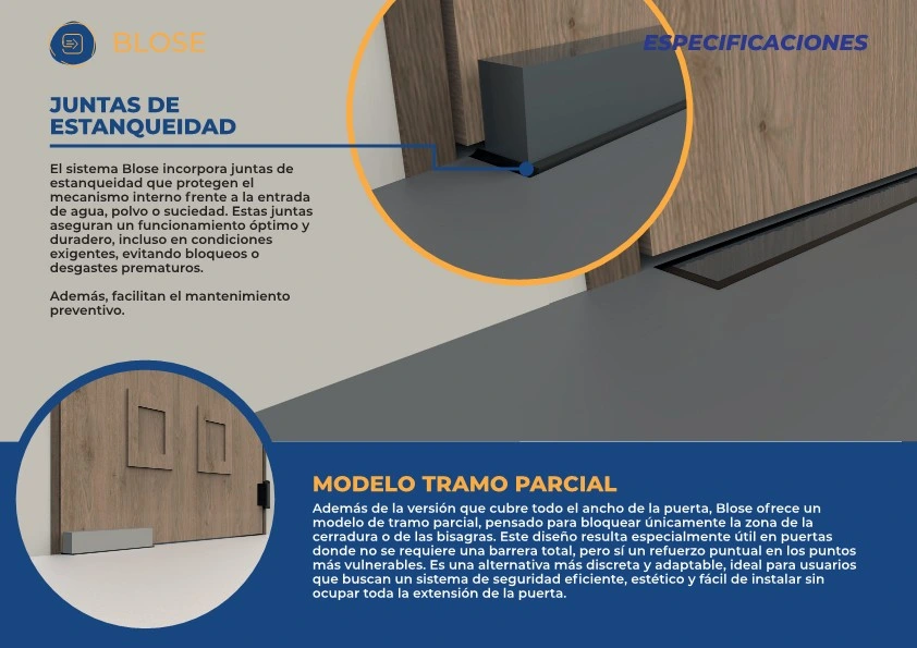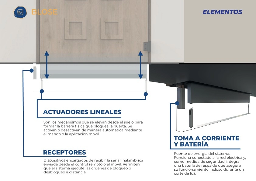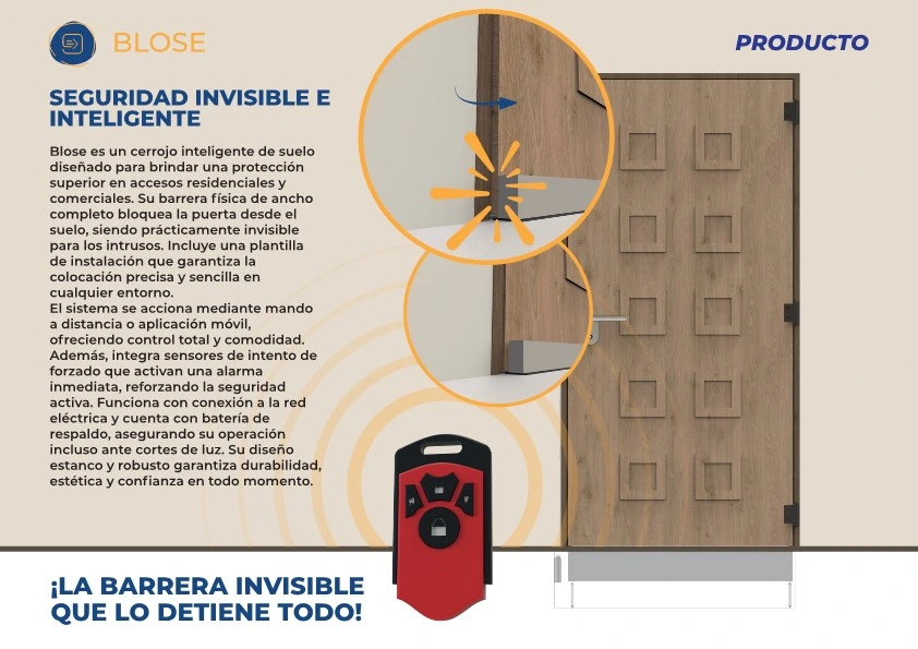 Es un sistema de bloqueo embutido en el suelo junto a una puerta, diseñado para ofrecer una solución de seguridad avanzada. A diferencia de las cerraduras tradicionales que se fijan al marco y son vulnerables a manipulaciones, este dispositivo cuenta con un mecanismo móvil que sobresale del suelo para bloquear la puerta de forma segura. Se controla remotamente mediante aplicación móvil o mando, e incorpora batería de respaldo y sensores anti-manipulación para alertar ante intentos de forzado.