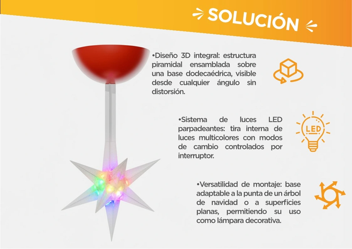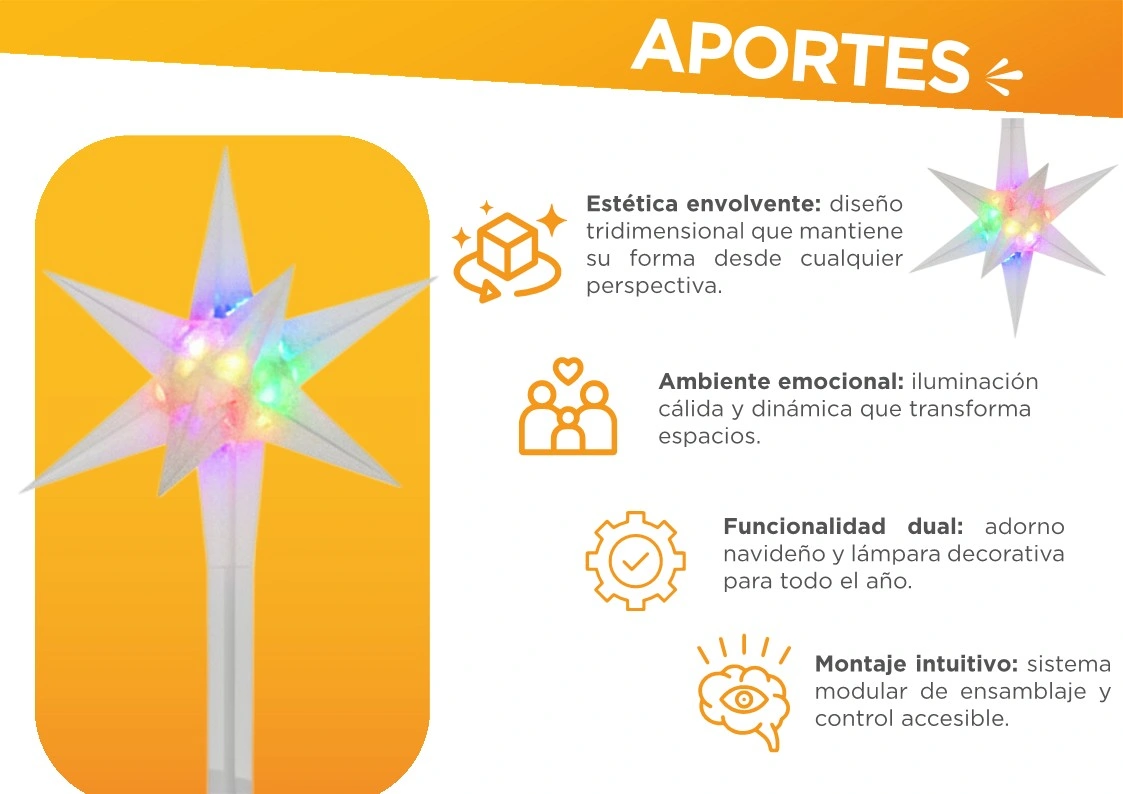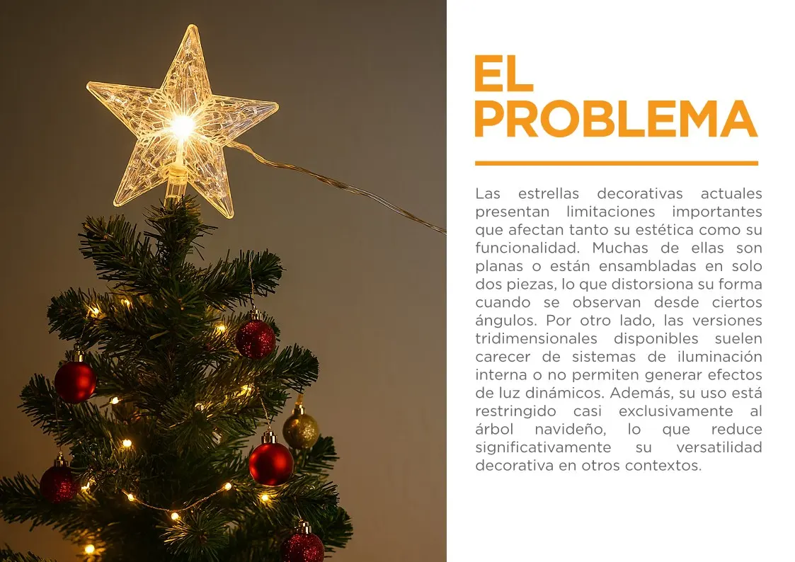 Representa una notable Innovación dispositivo iluminador al combinar su estructura modular para lograr una figura Estrella 3D para punta de árbol con efectos de luz dinámicos.