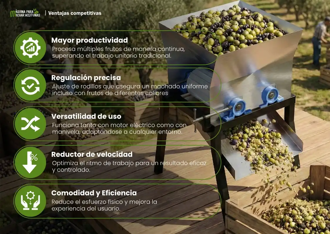 Entre sus principales ventajas destacan la reducción del esfuerzo físico, el aumento de la productividad y la uniformidad del machado. A diferencia del trabajo manual, esta maquinaria agrícola artesanal permite un procesado de aceitunas más rápido y constante. Además, su sistema de machado de frutos regulable mejora el control del proceso y evita daños innecesarios al fruto, optimizando la calidad final.