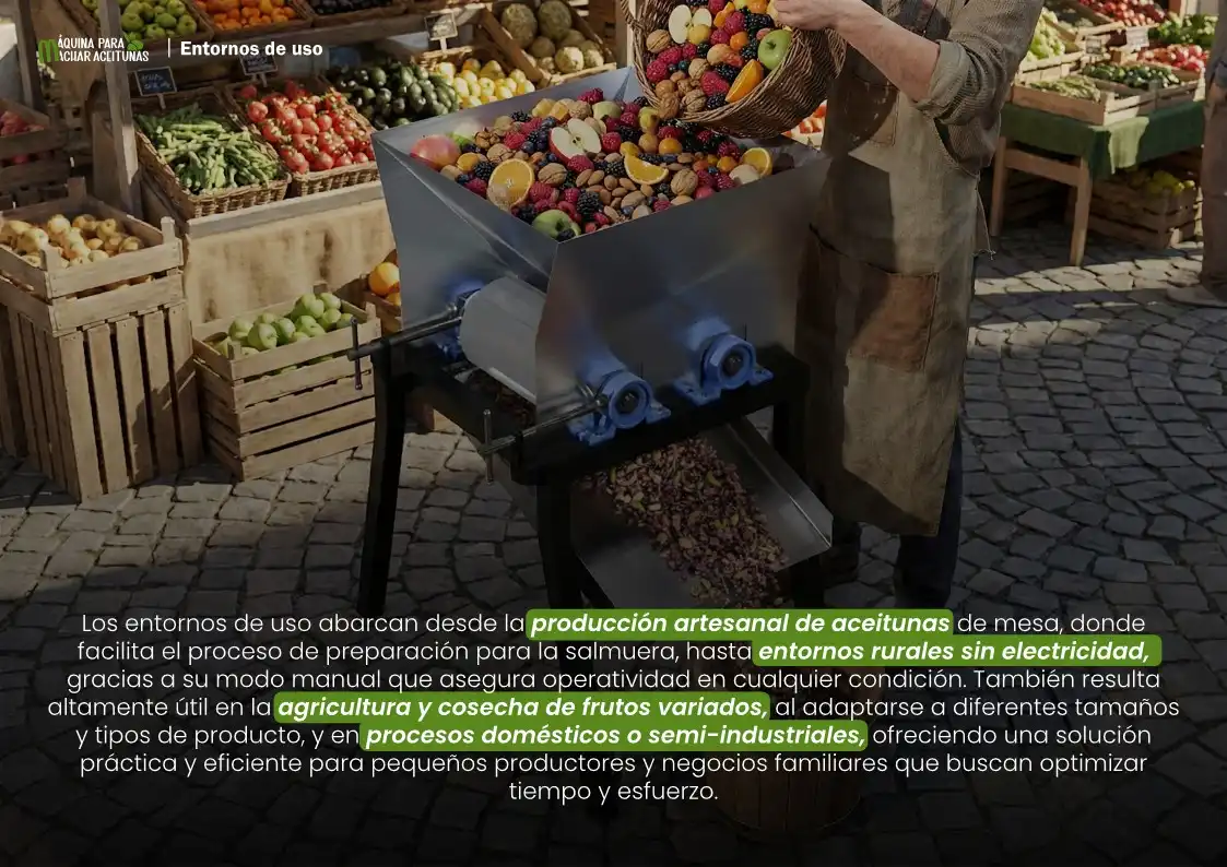 Funciona como máquina manual y eléctrica para machar aceitunas. Ofrece un machado continuo de frutos con motor o uso mediante manivela, siendo una maquinaria agrícola manual muy versátil