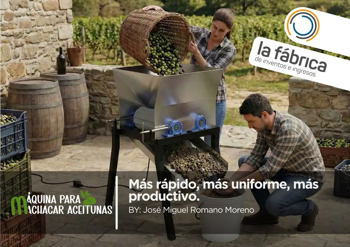 Como equipo para procesado de aceitunas, integra tolvas de entrada y salida eficientes. Esta máquina para machar aceitunas de La Fábrica de Inventos asegura una producción limpia, constante y organizada