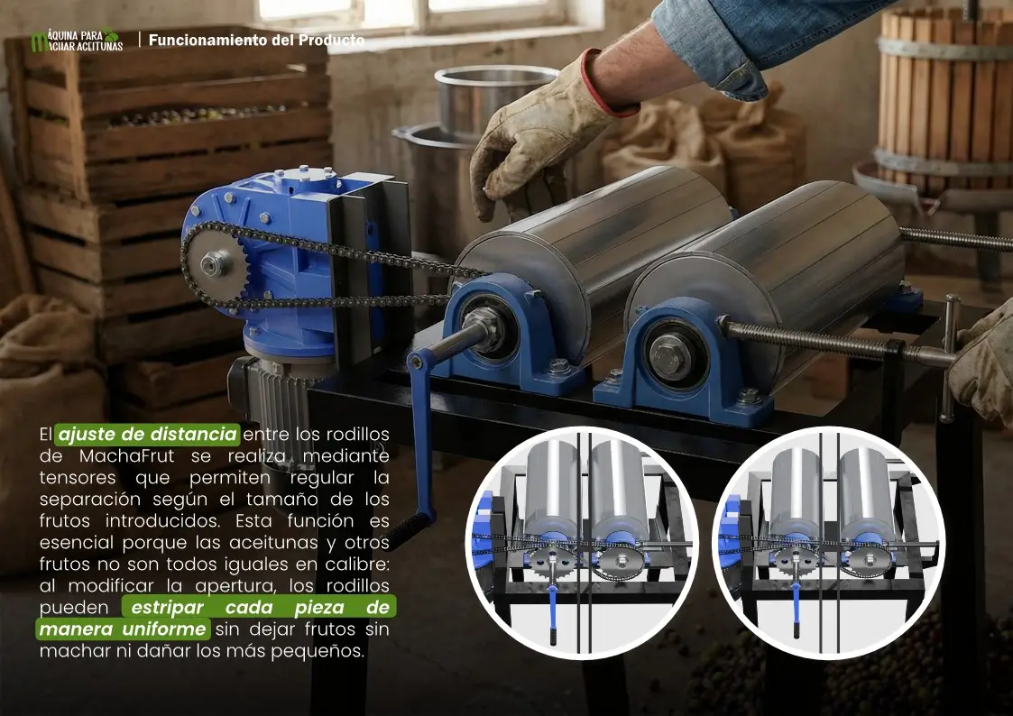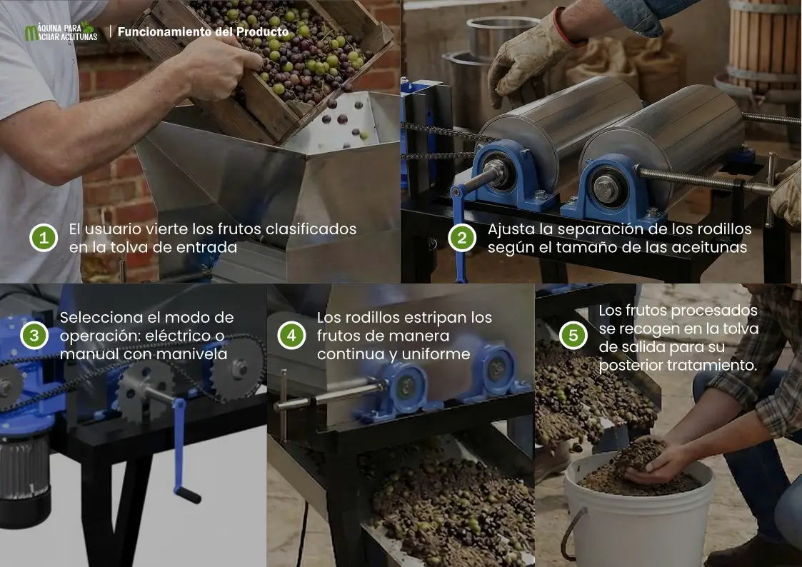 La máquina funciona mediante un conjunto de rodillos ajustables que realizan el machado del fruto al pasar entre ellos. Los frutos se introducen por una tolva superior y, tras el ajuste de separación, se procesan de forma continua hasta la tolva de salida. Este diseño la convierte en una máquina de rodillos ajustables para frutos, capaz de adaptarse a distintos tamaños. Puede accionarse como máquina manual y eléctrica para machar aceitunas, garantizando su uso incluso como máquina sin electricidad para machar frutos.