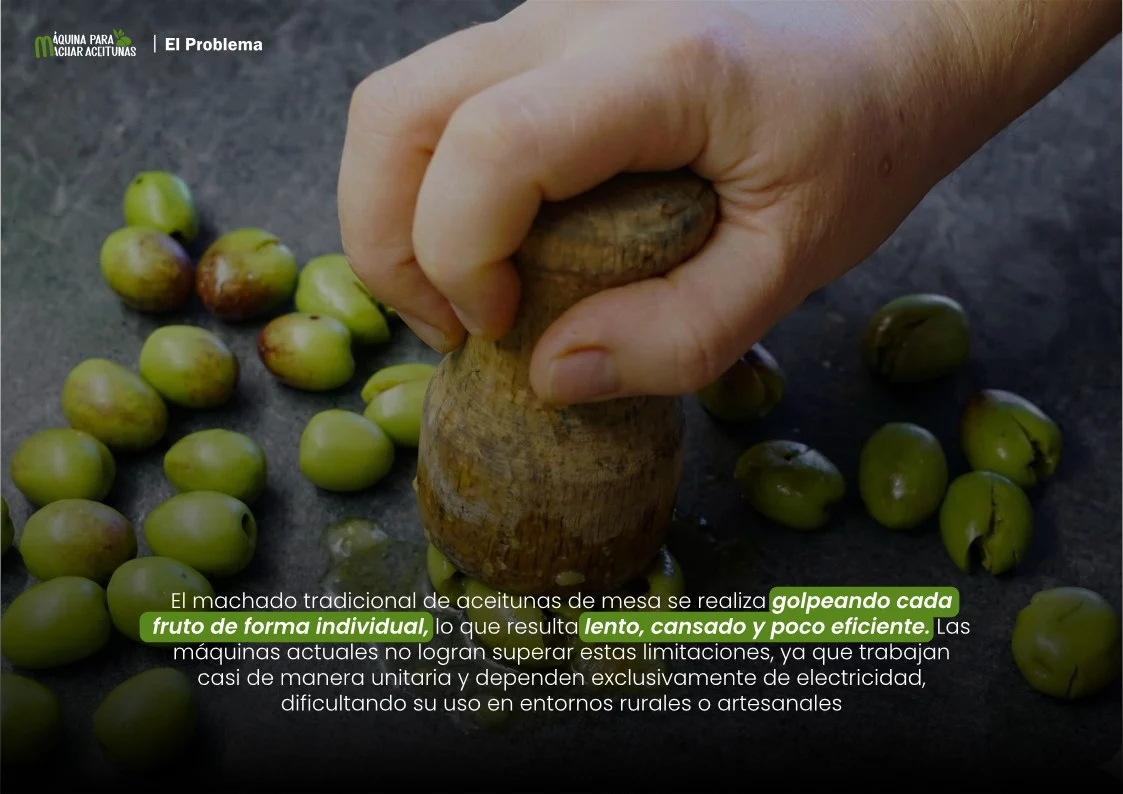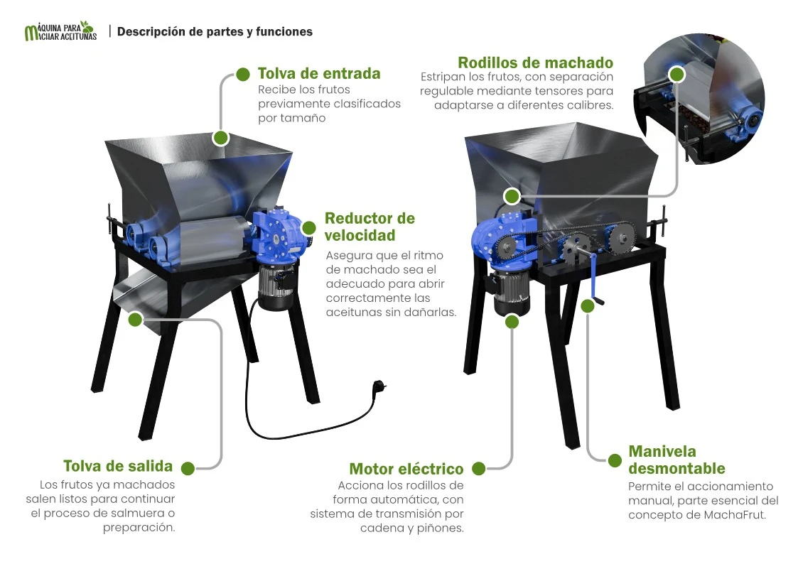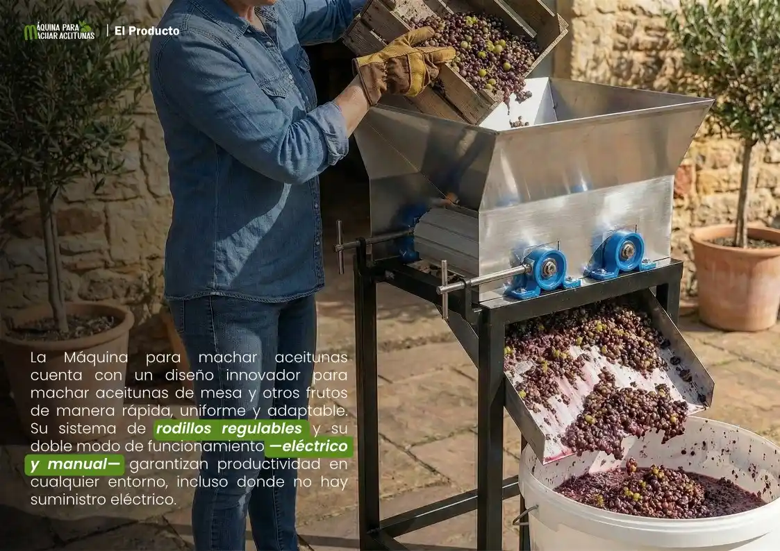 Solución mecánica eficiente y adaptable para el machado continuo de aceitunas y otros frutos, con funcionamiento eléctrico y manual