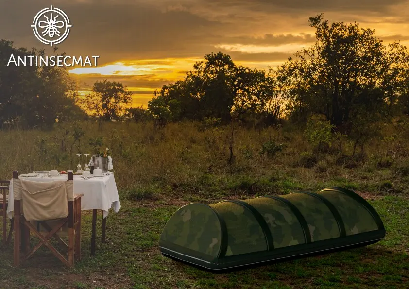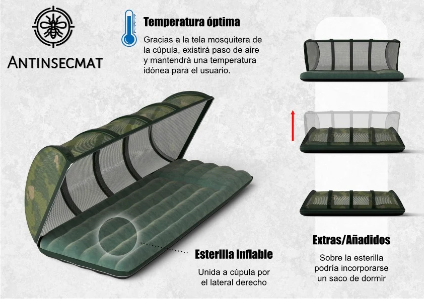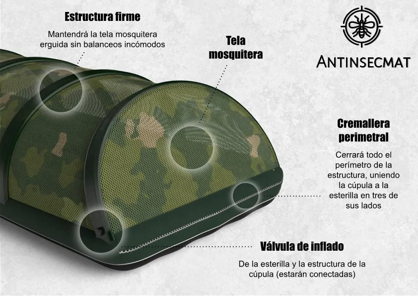 Funciona como esterilla con protector de mosquitos, saco de dormir antimosquitos hinchable o toalla de playa con mosquitera, garantizando bienestar en todo entorno.