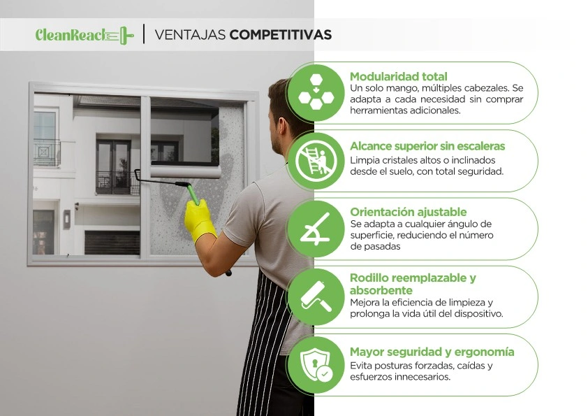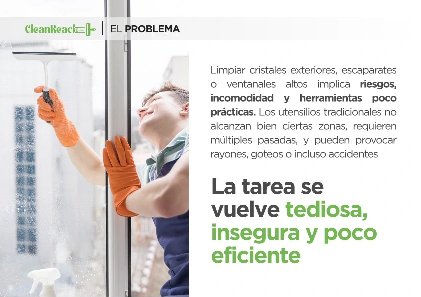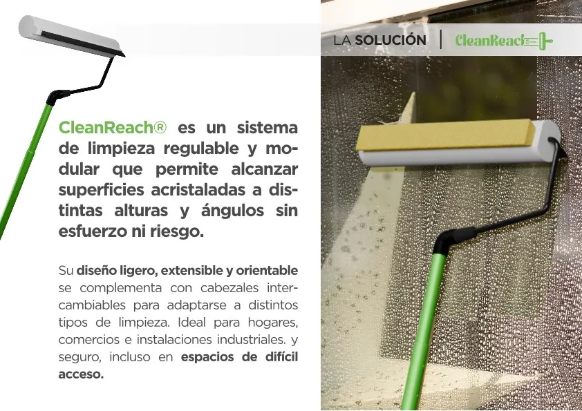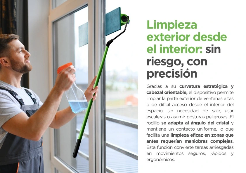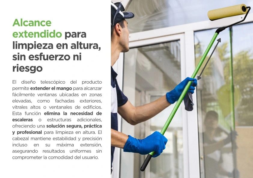 Permite limpiar ventanas en altura y superficies difíciles sin usar escaleras, eliminando el riesgo de caídas