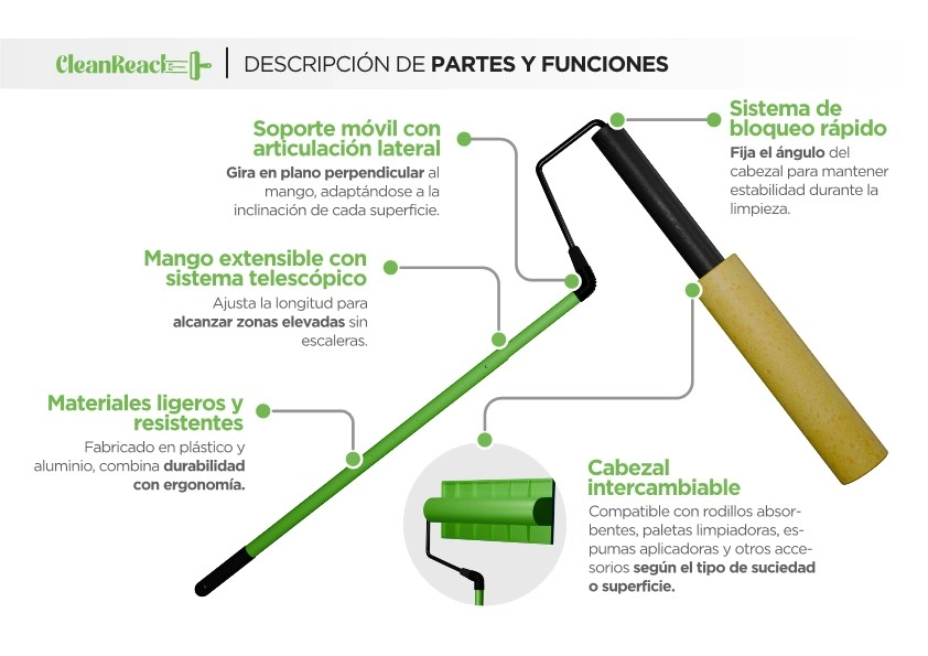 Es un utensilio ergonómico de limpieza que evita posturas incómodas, haciendo el trabajo más fácil y reduciendo la fatiga