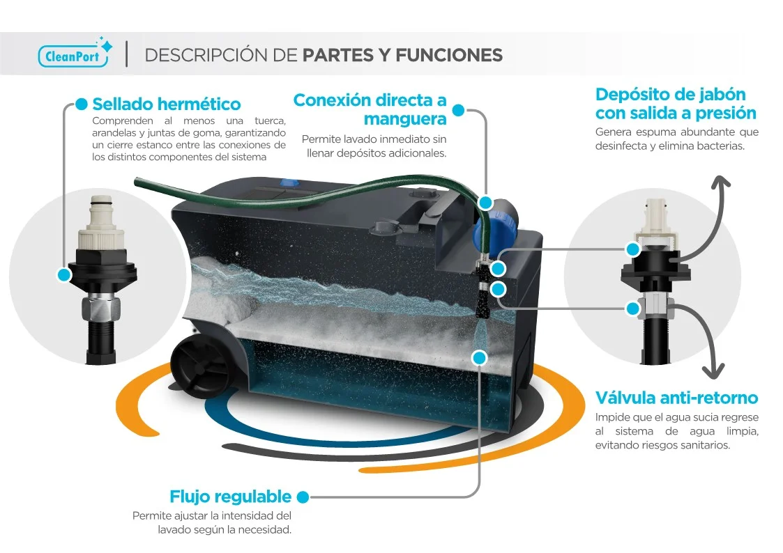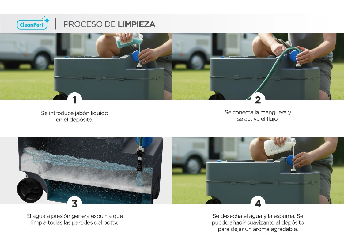 Realiza la limpieza eficiente de depósitos portátiles sin desmontar piezas ni manipular residuos